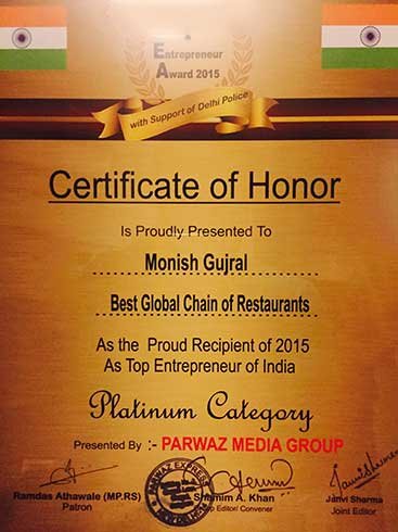 Best Global Chain of Indian Restaurants Awarded to Monish Gujral